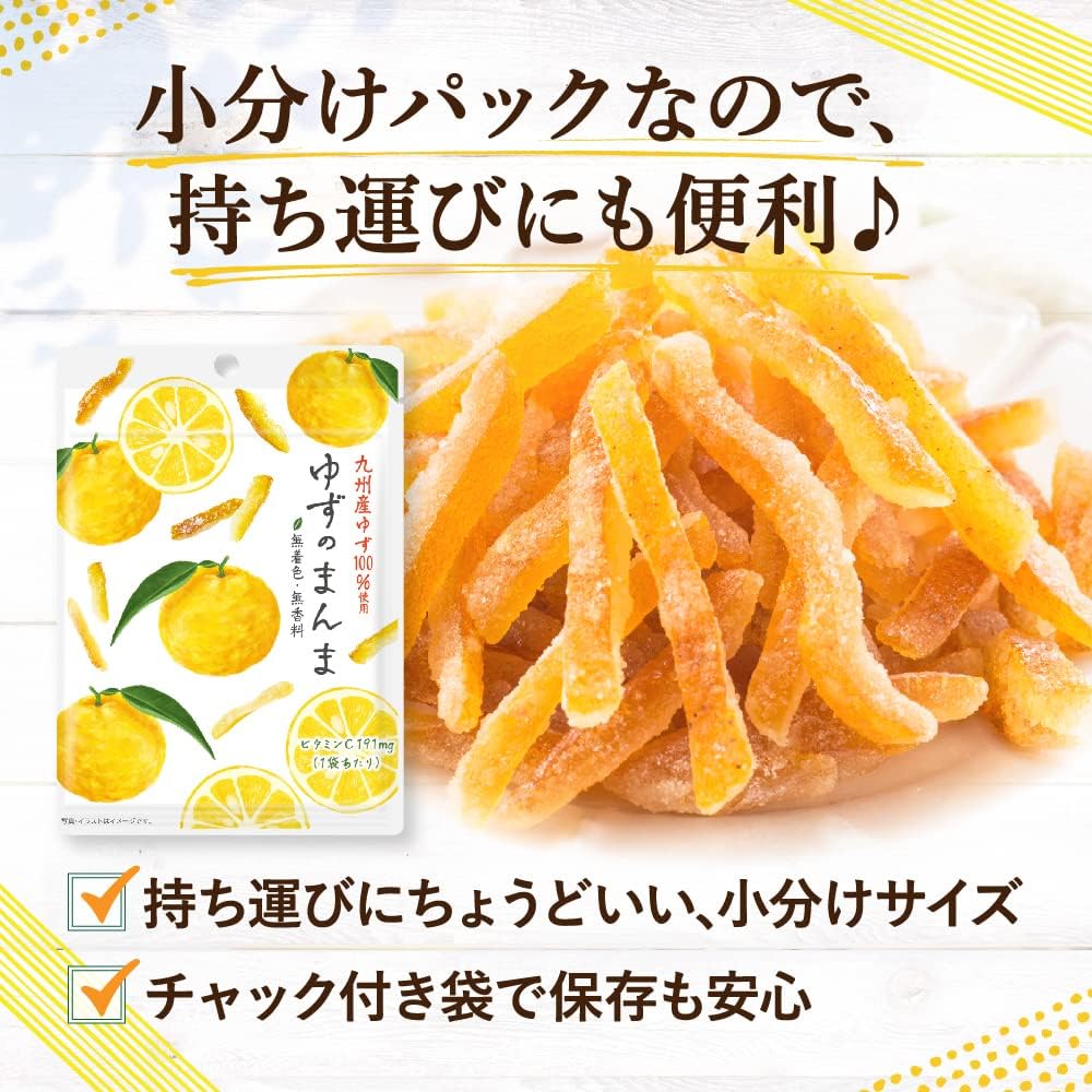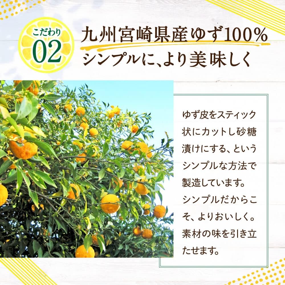 使用しているのは、九州産のゆず皮です。温暖な気候と豊かな土壌で育ったゆずは、とっても栄養豊富!ゆず皮に含まれるビタミンCは果汁の4倍ともいわれ、捨てるにはもったいない部分なのです。また、苦みの原因でもある白い部分は丁寧に除去していますので、美味しく味わっていただけます。