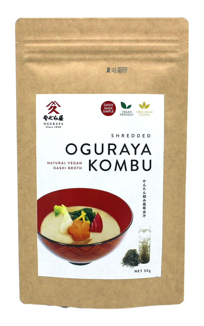 だしは、ラーメン、味噌汁、しゃぶしゃぶ、茶碗蒸しなど、数え切れないほどの日本のスープベースの料理の基礎であるだけでなく、多くの人から日本料理と日本の味の本質であると考えられています。鰹節の干し鰹節と昆布の干し鰹節に由来する、非常に濃厚なうま味のおかげで、日本料理に欠かせない食材です。 をぐらやの簡単刻み昆布だしは、天然昆布だしを使った、便利で完全にビーガンのだしです。パッケージには、事前に細かく刻んだ昆布が3種類も含まれているので、スープの準備に2倍の時間がかかりますが、だしの密度が10%高くなります。スープの作り方に使った昆布は、今度はサラダなどの具材として再利用できます。 水1リットルあたり10gの昆布を加えると、濃厚で香り高く、濃厚なだしができます。一方、水1リットルあたり5gは、日常の使用に適しています。用意した量の昆布に1リットルの軟水を入れて冷蔵庫に入れて40分待つか、1リットルの沸騰したお湯を入れて5分待ちます。