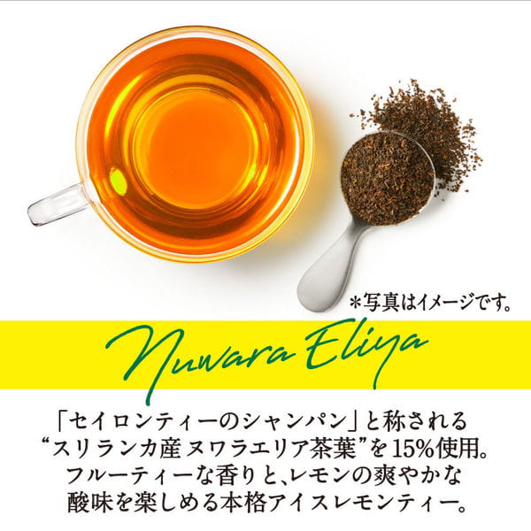 レモンティーと相性が良く、フルーティーな香りが特長の「ヌワラエリア茶葉」を全茶葉の内、15%使用。丁寧に抽出することで、紅茶葉の豊かな香りとレモンの爽やかな酸味を楽しめる本格レモンティー。(果汁0.1%)