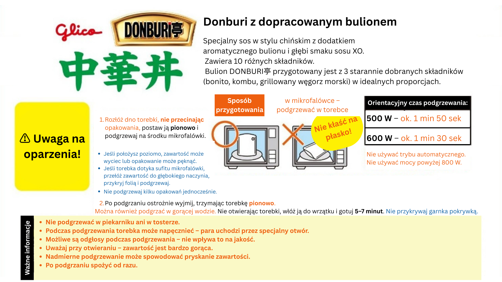 Seria Donburi-Tei została stworzona z myślą o wygodzie – w Japonii to popularny wybór na szybki obiad lub kolację w domowym stylu. Wystarczy podgrzać zawartość opakowania i podać na świeżo ugotowanym ryżu, aby w kilka minut cieszyć się daniem jak z japońskiej restauracji.