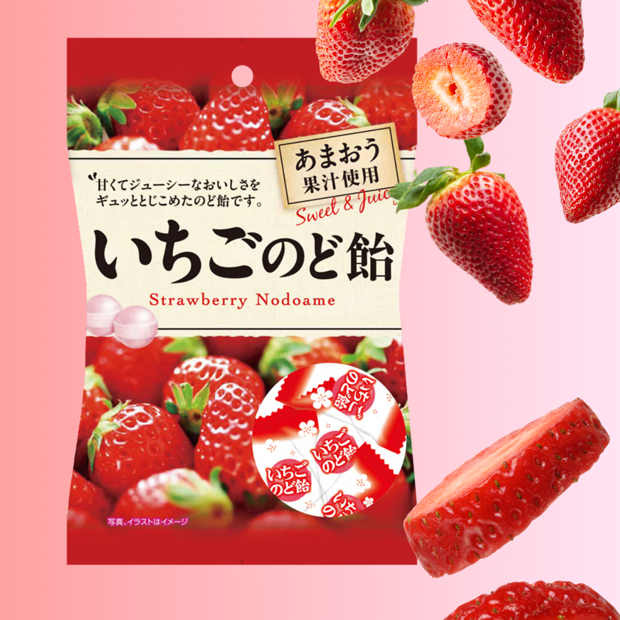 Spróbuj ziołowych cukierków na gardło z dodatkiem soku z truskawek Amaou od firmy Pine! Amaou to gatunek znany w Japonii jako "król truskawek", charakteryzujący się swoim rozmiarem, jasnym czerwonym kolorem oraz wyjątkową słodyczą. Ekstrakt ziołowy zawarty w landrynkach posiada łagodny, odpowiedni dla każdego smak, w tym dla osób nie przepadających za mocnymi miętowymi smakami.