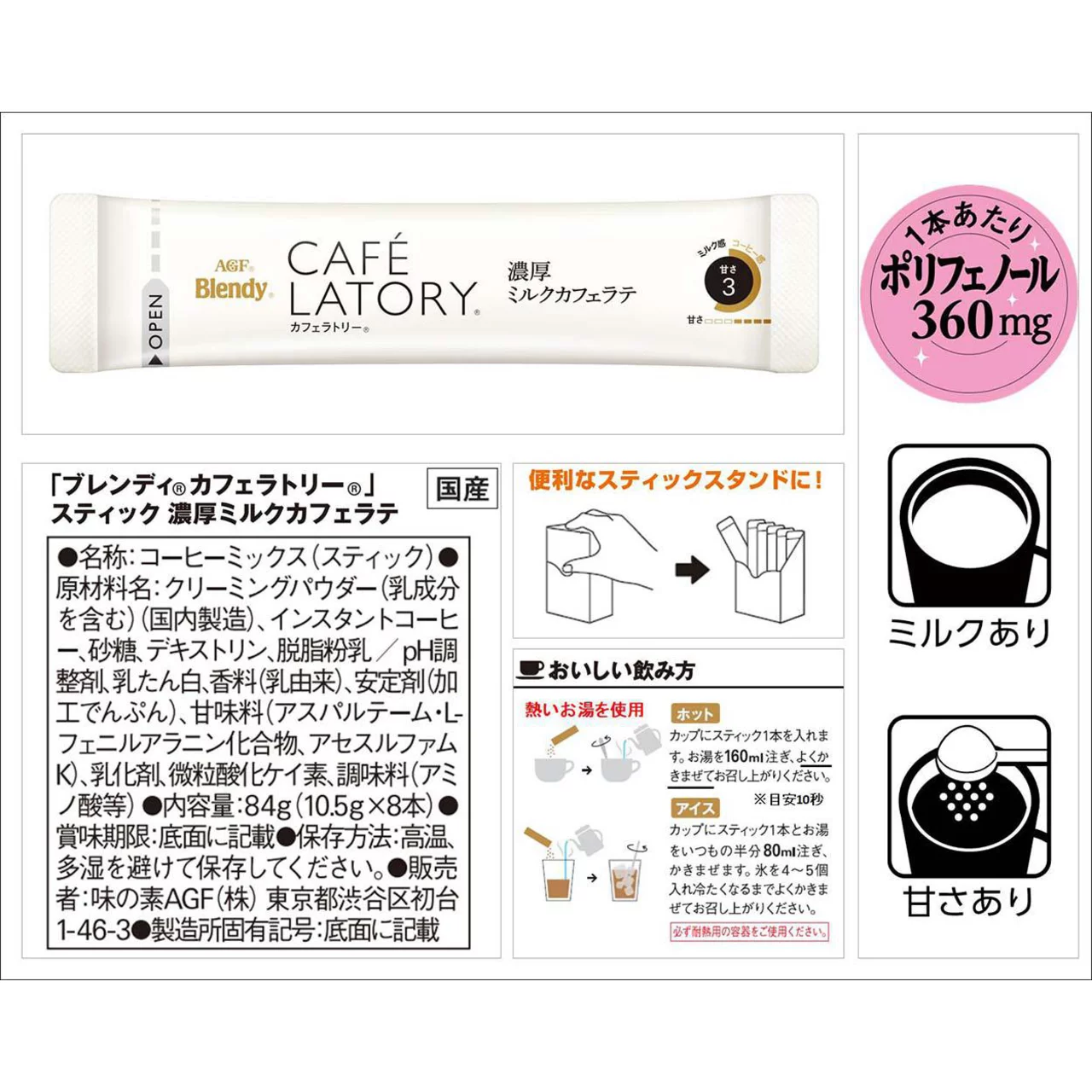 Skład:Proszek do śmietanki (zawiera składniki mleczne) (wyprodukowano w Japonii), kawa rozpuszczalna, cukier, dekstryna, odtłuszczone mleko w proszku, sól / białko mleka, regulator pH, aromat (pochodzący z mleka), stabilizator (modyfikowana skrobia), substancja słodząca (aspartam, związek L-fenyloalaniny, acesulfam K), emulgator, dwutlenek krzemu, przyprawa (aminokwasy itp.)