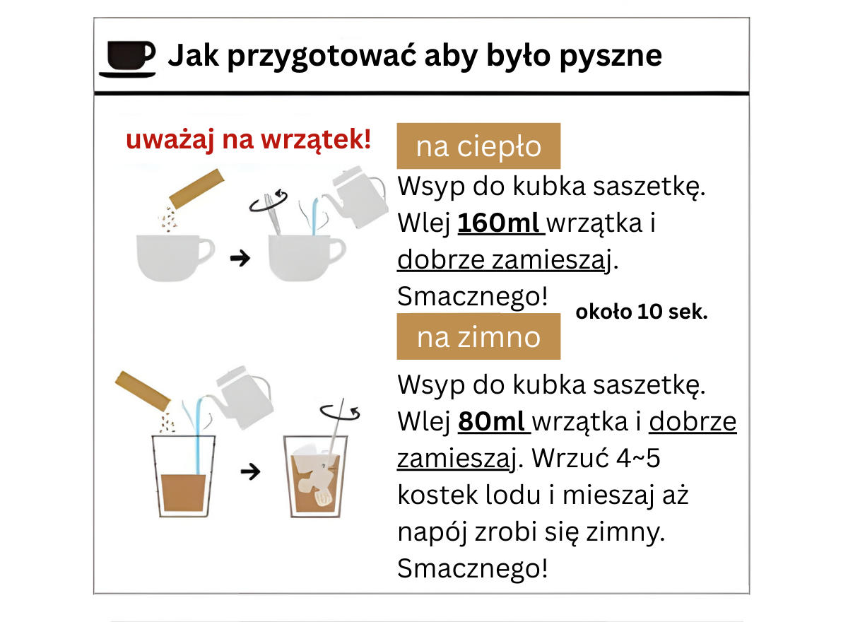 • Szybkie i proste przygotowanie: Jedna porcja w sticku, gorąca woda i gotowe – bez ekspresu czy dodatkowych składników.