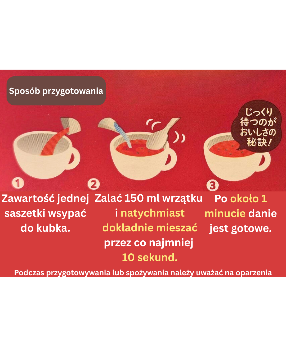 - Przesypać do kubka 1 porcję zupy i zalać 150ml gorącej wody.