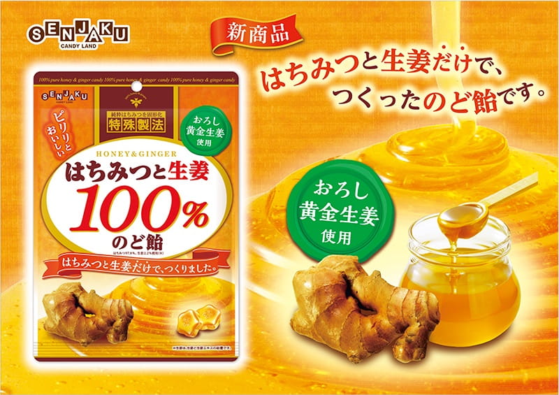 Odkryj w pełni naturalne smaki dwóch prostych składników z cukierkami od firmy Senjaku! To soczysta słodycz płynąca z połączenia prawdziwego miodu z wyrazistym smakiem korzenia imbiru. Cukierki Honey & Ginger zostały wykonane w 100% z miodu i imbiru, dlatego jest to idealna słodkość dla tych, którzy lubią nieco ostrzejsze smaki i poszukują autentycznych doznań!