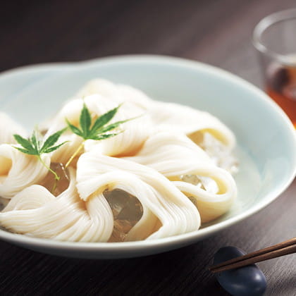 手延そうめん「揖保乃糸」は、厳選した小麦と赤穂の塩を原料に、そうめん作りに適した豊かな気候風土に育まれてきました。およそ600年受け継がれる伝統の手延製法で、幾度も熟成を重ねながら、職人が丹精込めて作り上げた播州地方の名品です。