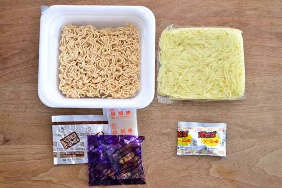 Skład: smażony makaron (MĄKA PSZENNA (wyprodukowana w Japonii), olej roślinny, rafinowany smalec, sól, sos sojowy, przyprawy, warzywa w proszku, białko JAJKA), przyprawy i dodatki (olej roślinny, cukier, sól, sos, przyprawy, dekstryna, zielona morszczyn, sos SOJOWY, marynowany imbir), składniki (kapusta, przyprawione mięso mielone), przetworzona skrobia, trehaloza, przyprawy (aminokwasy itp.), barwnik karmelowy, węglan wapnia, kansui, przeciwutleniacze (witamina E, ekstrakt z rozmarynu), witamina B2, witamina B1, substancja zakwaszająca, ekstrakt z przypraw (zawiera skladniki PSZENICY, JAJKA MLEKA, SEZAM, SOJĘ, kurczaka, wieprzowinę, jabłko).
