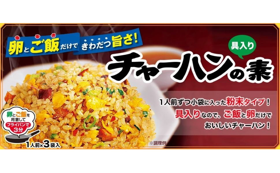 内容量は 6.8g × 3袋入り。厳選されたスパイスと調味料が、炒めたご飯にほんのり甘みのあるかにかまの風味を加え、香ばしく仕上げます。フライパンでご飯とお好みの具材を炒め、粉末を混ぜるだけで、あっという間に香り豊かで食欲をそそる一品が完成。