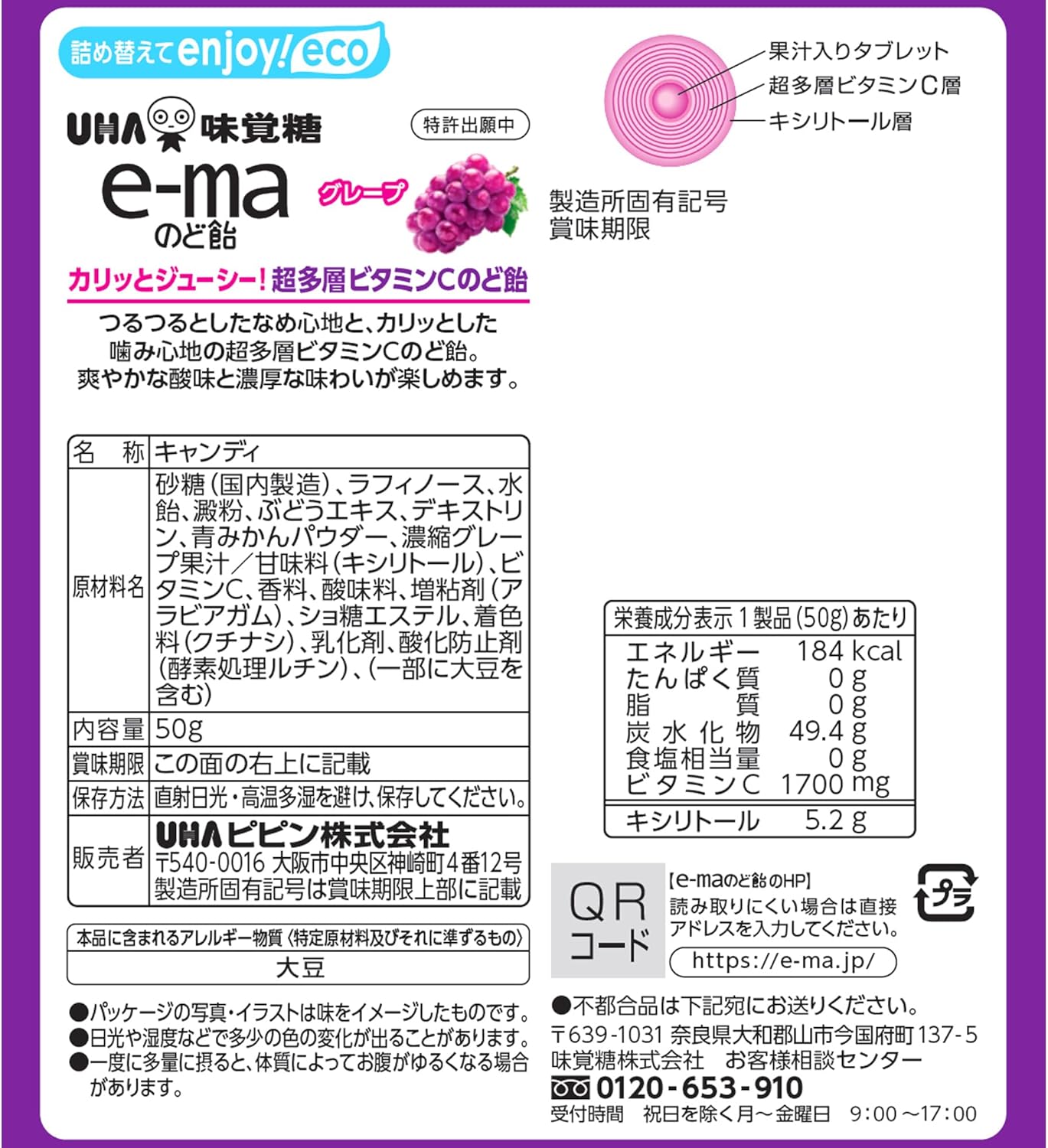 UHA味覚糖 e-maのど飴袋グレープ 50g