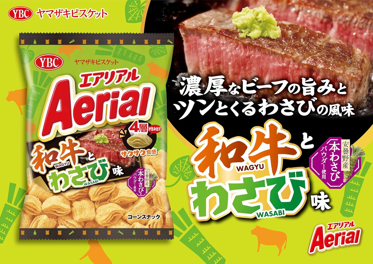 YBC Aerial wielowarstwowe chipsy kukurydziane o smaku Wasabi & Wołowina Wagyu, 65g