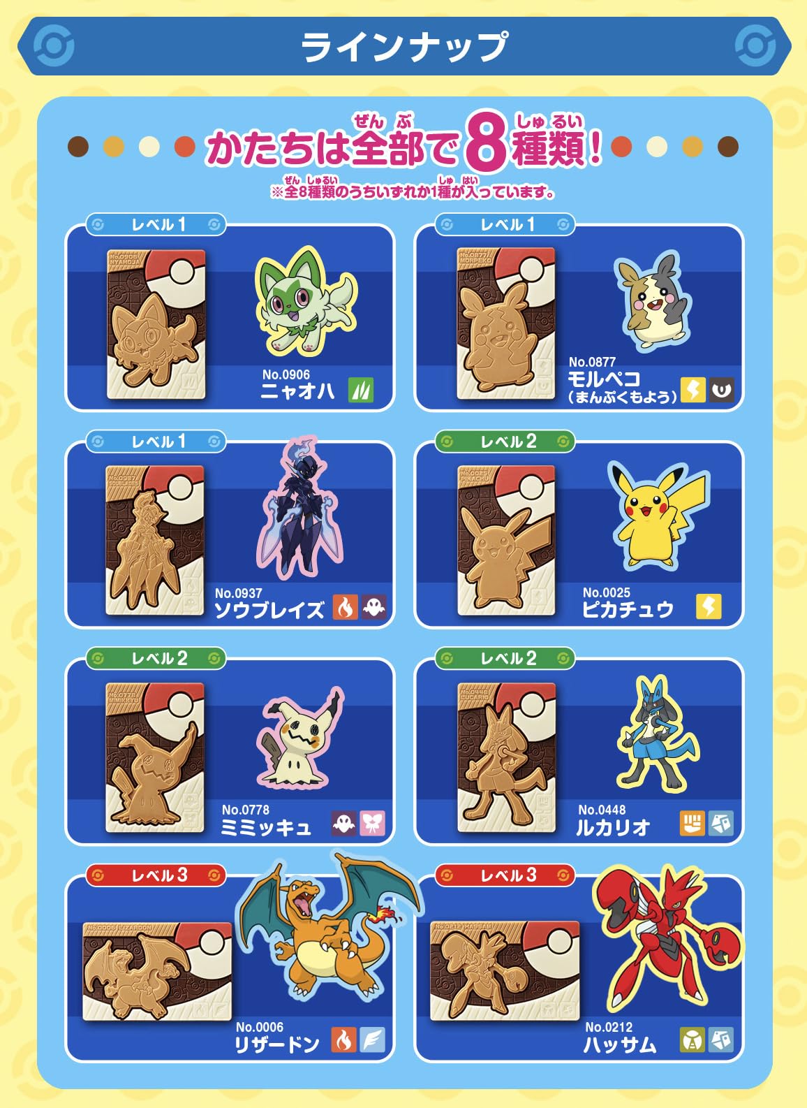 Każda z tabliczek składa się z różnokolorowych, czekoladowych elementów o 4 różnych smakach: karmelowym, truskawkowym, białej czekolady i czekolady mlecznej z ryżem preparowanym. Na środku znajdziesz jednego z 8 Pokémonów:
