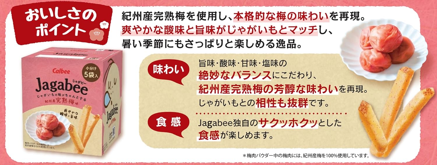Poznaj Jagabee w nietypowej, ale wyjątkowo smacznej wersji o smaku śliwki ume – klasycznych japońskich chipsów ziemniaczanych od renomowanej marki Calbee. Grube słupki zachwycają naturalnym smakiem ziemniaka, a dodatek aromatycznej śliwki ume nadaje im lekko kwaśno-słodki, orzeźwiający charakter, typowy dla japońskich przekąsek.