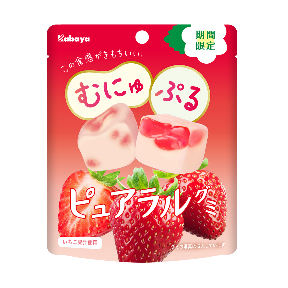 Daj się zaskoczyć orzeźwiającą słodyczą żelków owocowych Pureral od firmy Kabaya! Nazwa żelków Pureral stanowi kombinację słów pure (bez domieszek) oraz natural (naturalny), które cechują wyjątkowo wyrazisty aromat truskawek, który roznosi się tuż po otwarciu opakowania. W każdym żelku poczujesz aż dwie różne tekstury: nieco sprężystą, która swoją konsystencję zawdzięcza niezliczonym, malutkim pęcherzykom powietrznym oraz drugą, soczystą, galaretko-podobną. Unikalna słodycz o naturalnym, lekko kwaśnym smaku truskawek.