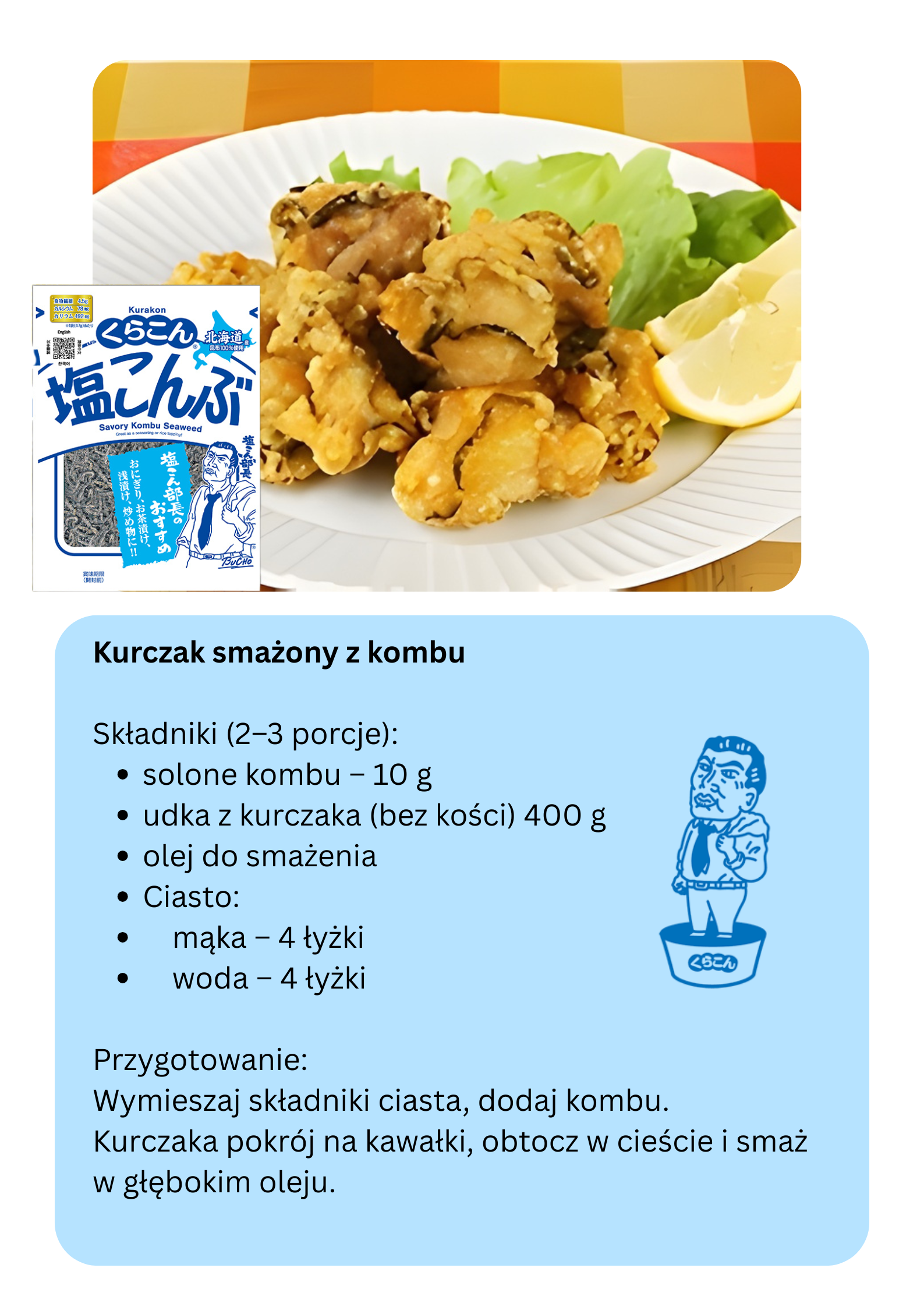 Skład: wodorosty konbu (z Hokkaido), sos SOJOWY (w tym SOJA i PSZENICA), sól, hydrolizat białka (w tym SOJA)/substancje słodzące (sorbitol, lukrecja), przyprawy (aminokwasy itp.), barwniki karmelowe.