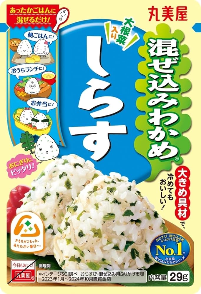 Skład: Aromat wakame (wakame, sól, syrop skrobiowy, proszek z ekstraktu drożdżowego, cukier, dekstryna, olej w proszku), przyprawiony shirasu (biała ryba, sól, sos sojowy, olej palmowy), laktoza, prażone nasiona sezamu, przyprawiona rzodkiew daikon (rzodkiew daikon, sól, cukier), sól, proszek z sardynek, proszek z ekstraktu z małży, cukier, proszek z ekstraktu z owoców morza, skrobia/przyprawa (aminokwasy itp.), barwnik karmelowy (witamina E), (zawiera składniki mleczne, pszenicę, sezam, soję)