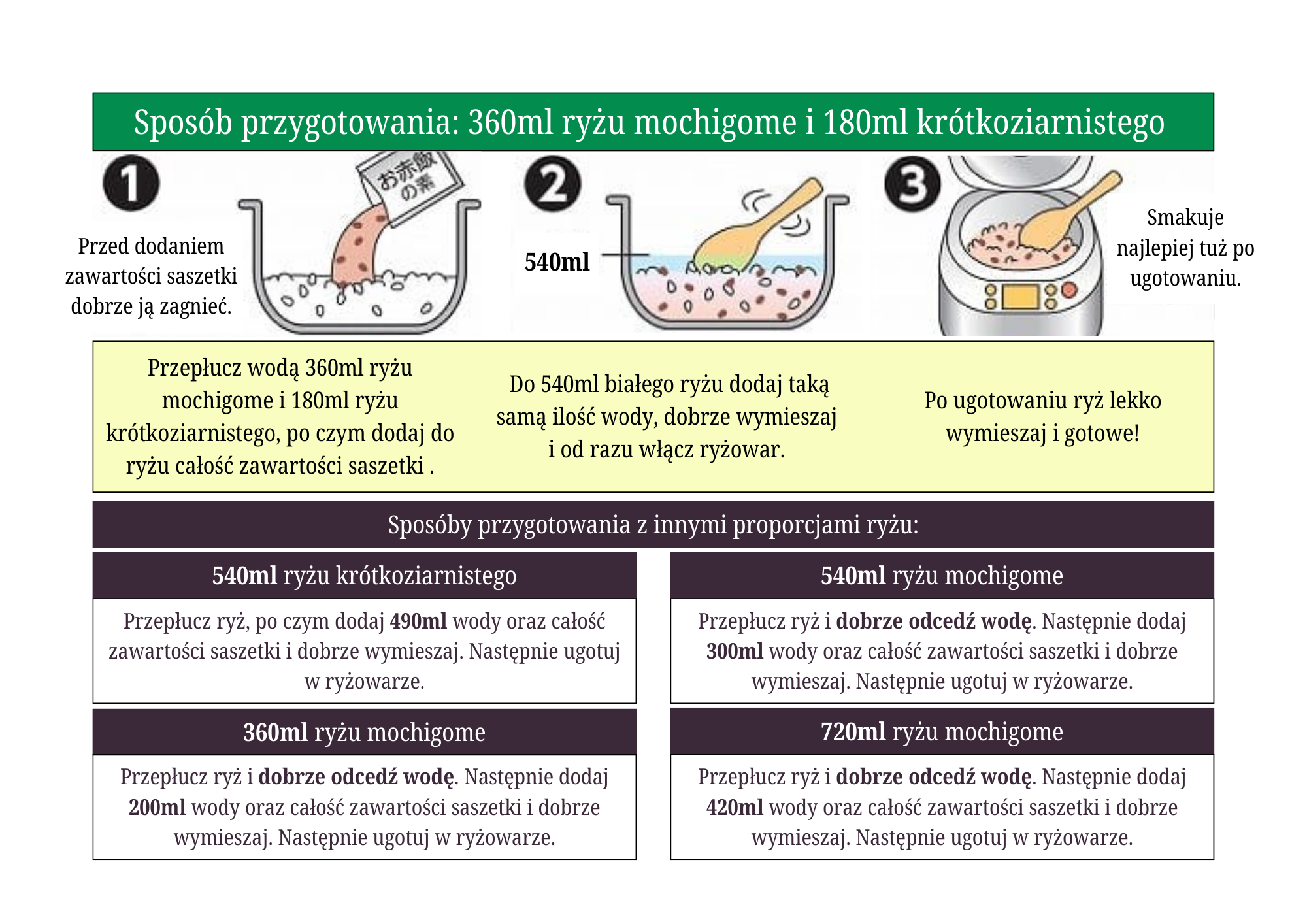 Marumiya przygotowała wygodną bazę do Sekihan, dzięki której możesz szybko i łatwo stworzyć autentyczny czerwony ryż w domu — bez konieczności długiego przygotowywania fasoli czy mieszania składników. W opakowaniu znajdziesz idealnie dobraną mieszankę gotowego ryżu i fasoli Adzuki, która zachowuje tradycyjny smak i kolor tego wyjątkowego dania.