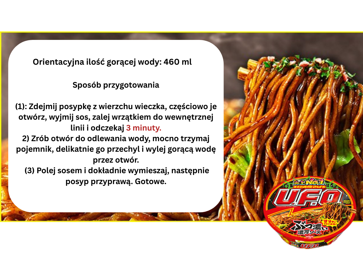 Nissin U.F.O. Yakisoba to jeden z najpopularniejszych instantów w Japonii, który oddaje smak klasycznego yakisoba – czyli smażonego makaronu w stylu japońskim, często serwowanego na festiwalach i ulicznych stoiskach. Producentem jest Nissin, legenda w świecie dań błyskawicznych i twórca pierwszego na świecie ramen instant.