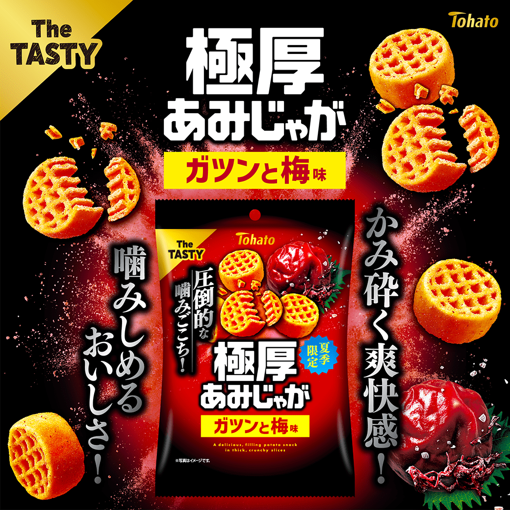 Szukasz przekąski, która naprawdę zaskakuje? Ami-Jaga Goku-Atsu od Tohato to grubo krojone chipsy ziemniaczane w formie charakterystycznej, kraciastej siateczki, o mocnym i orzeźwiająco-kwaśnym smaku japońskiej śliwki umeboshi. Słono-kwaśne, lekko owocowe – idealne dla tych, którzy szukają niebanalnych wrażeń smakowych prosto z Japonii.