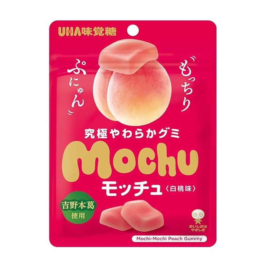 Mocchuu od UHA Mikakutō to wyjątkowe żelki, które naśladują konsystencję świeżego mochi – delikatnie sprężystą, miękką i przyjemnie ciągnącą. Wersja o smaku białej brzoskwini (hakutō) zachwyca owocowym aromatem i naturalną słodyczą tego cenionego w Japonii owocu. Każdy kęs to przyjemne połączenie lekkiej kwaskowatości i głębokiego, soczystego smaku, który przywodzi na myśl letnie owoce z japońskich sadów.